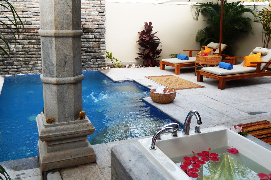 Teak floors, high ceilings and generous proportions, locally handmade wooden furniture and antique and contemporary objets d’art from Kerala, complete the ambience, giving this destination its own special charm. Yet despite the timeless construction of our cottages, every modern comfort is supplied. Sleep deeply in large, comfortable beds which can be arranged as a double or twins as required. Bathe in the open air in your own outdoor bathroom or relax in a private plunge pool. Sip tea on the shaded veranda of your accommodation and drink in the scenery.