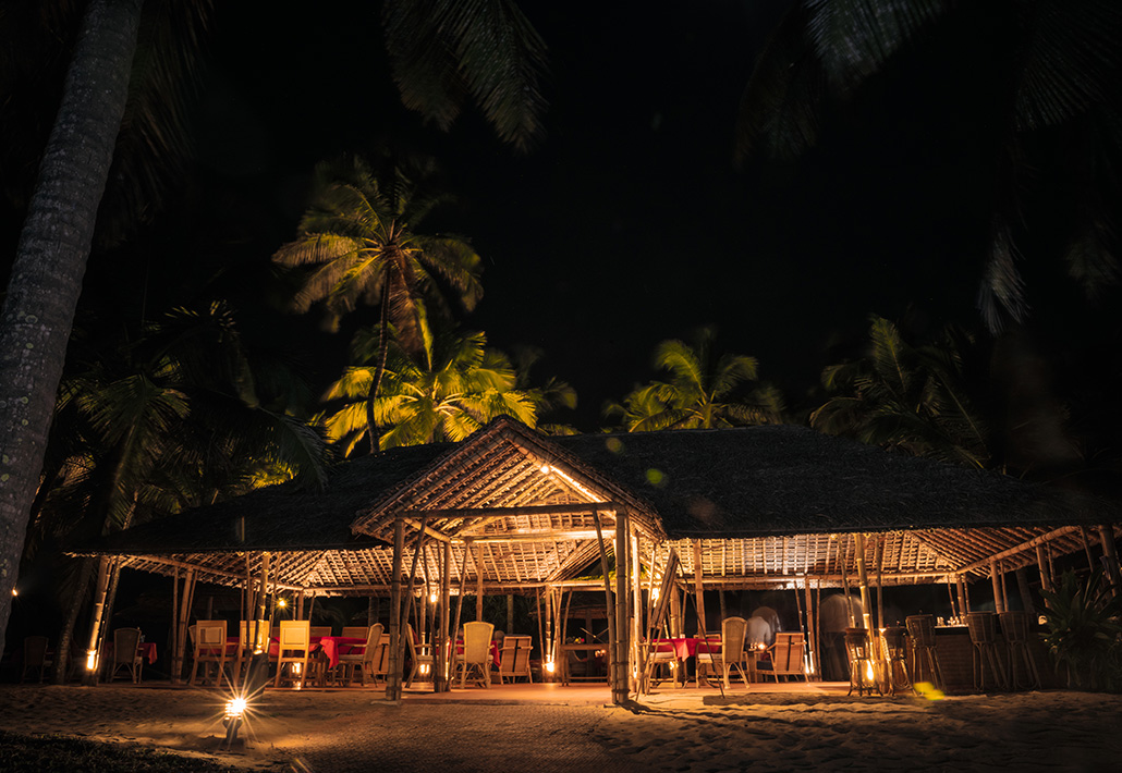 The Annapurna dining room consumes virtually no energy. Its elegant pillared lateral spaces are open to the verdant gardens on all sides, allowing a sea-cooled breeze to circulate, while the warmer air is released upwards through the large, open light well that stands in the centre of the hall. With such natural ventilation secured, there is no need for air-conditioning, which is very costly in energy terms, and during the day, no need for any electricity. What light is needed after dark is subdued and comes from small and localised sources, while the dining tables and sitting areas are lit by candles.