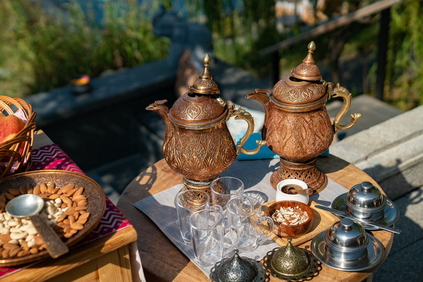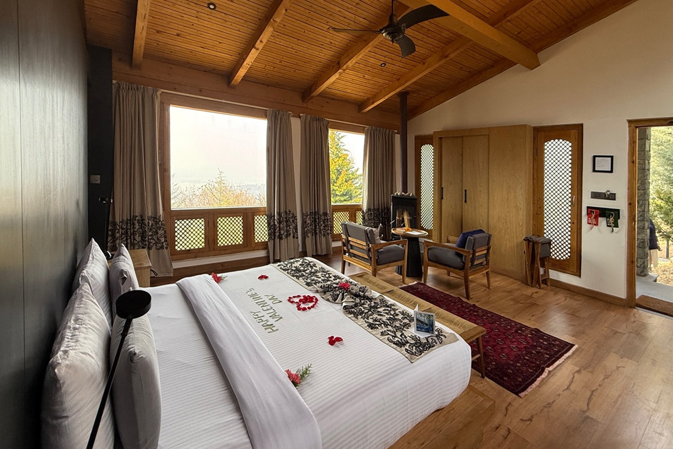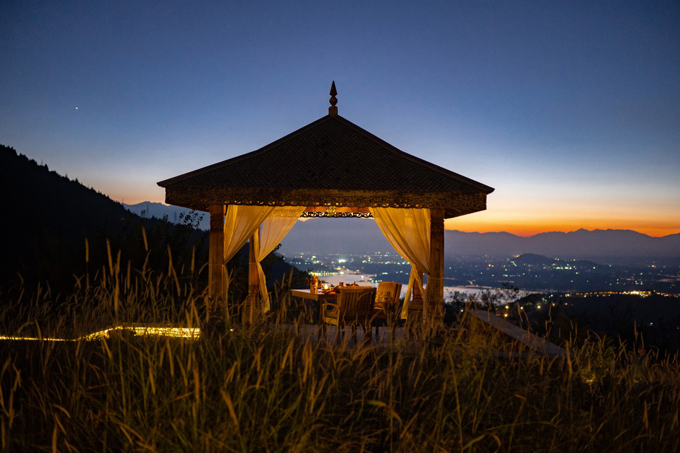 In Kashmir, enjoy two nights at Qayaam Gah and one night aboard the Sukoon Houseboat. Your stay includes seamless transfers, a private Shikara ride, a guided visit to the Mughal Gardens, daily breakfast, evening high tea accompanied by local music, and dinner curated to your preference.